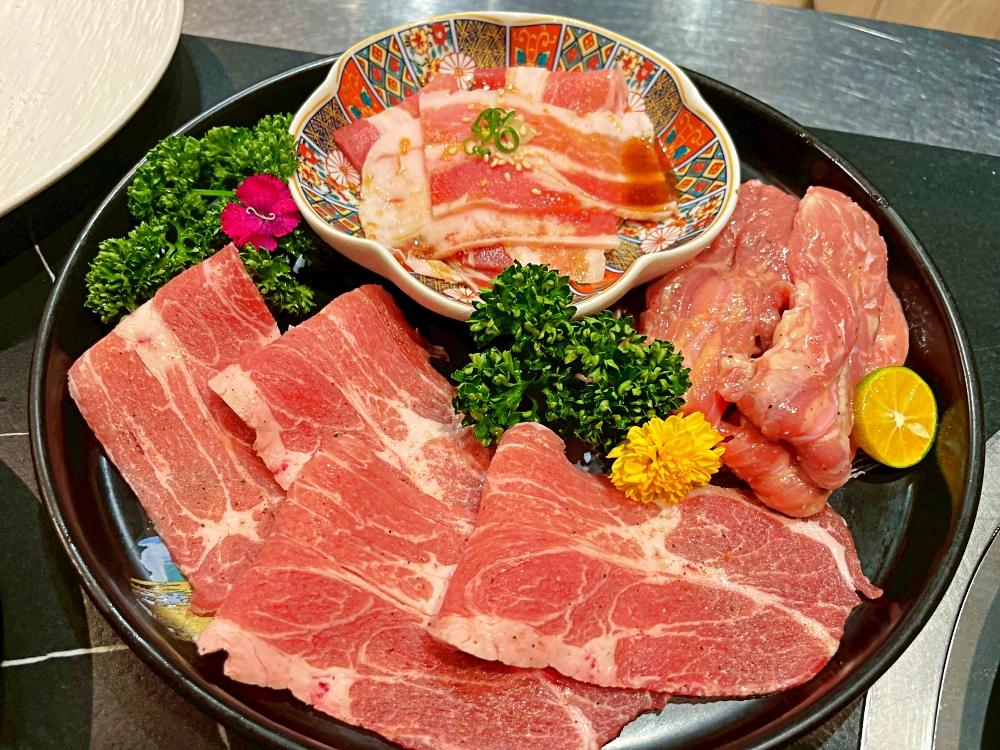 套餐肉品有牛五花、後腹肉、牛肋條、豬五花、豬梅花、雞頸肉及季節蔬菜。