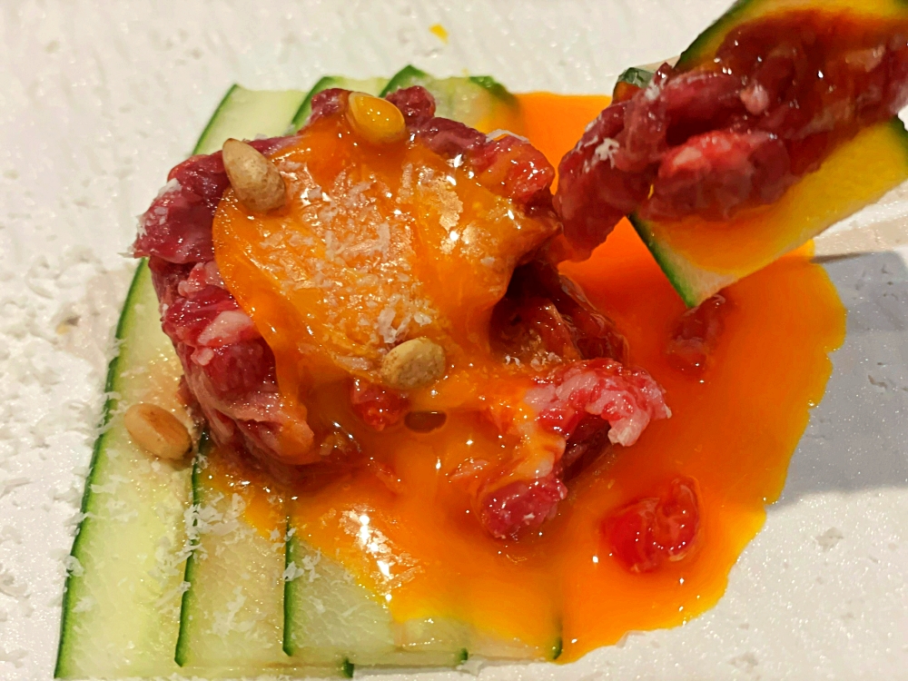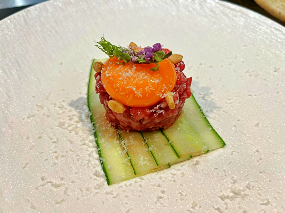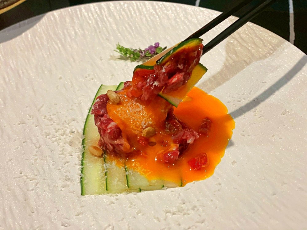 搭配蛋黃、小黃瓜絲、帕馬森起司,不走傳統重鹹的韓式,而是偏清爽的風格,可以吃到牛肉原味的甜,吃完胃口真的會被打開。