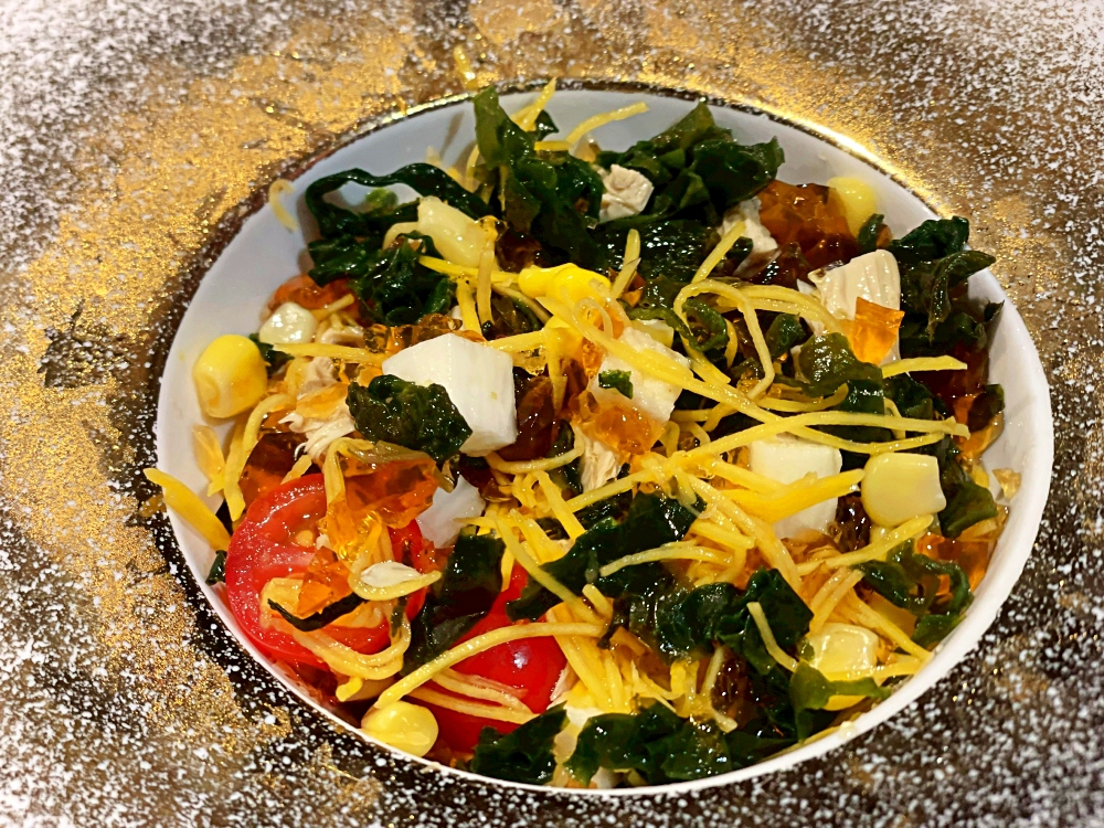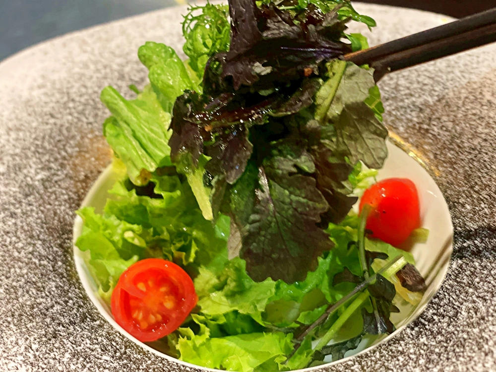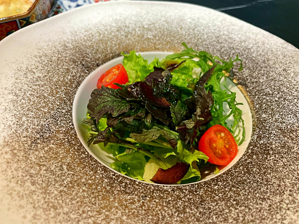 山藥、土佐醋凍、海帶、番茄、玉米、豆包堆出一盤漂亮又開胃的沙拉,酸香很舒服,連平常不愛沙拉的人都會吃光。